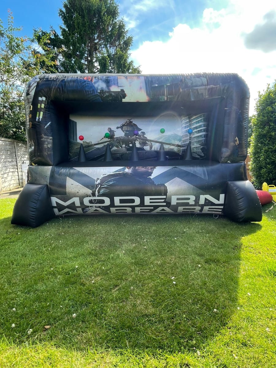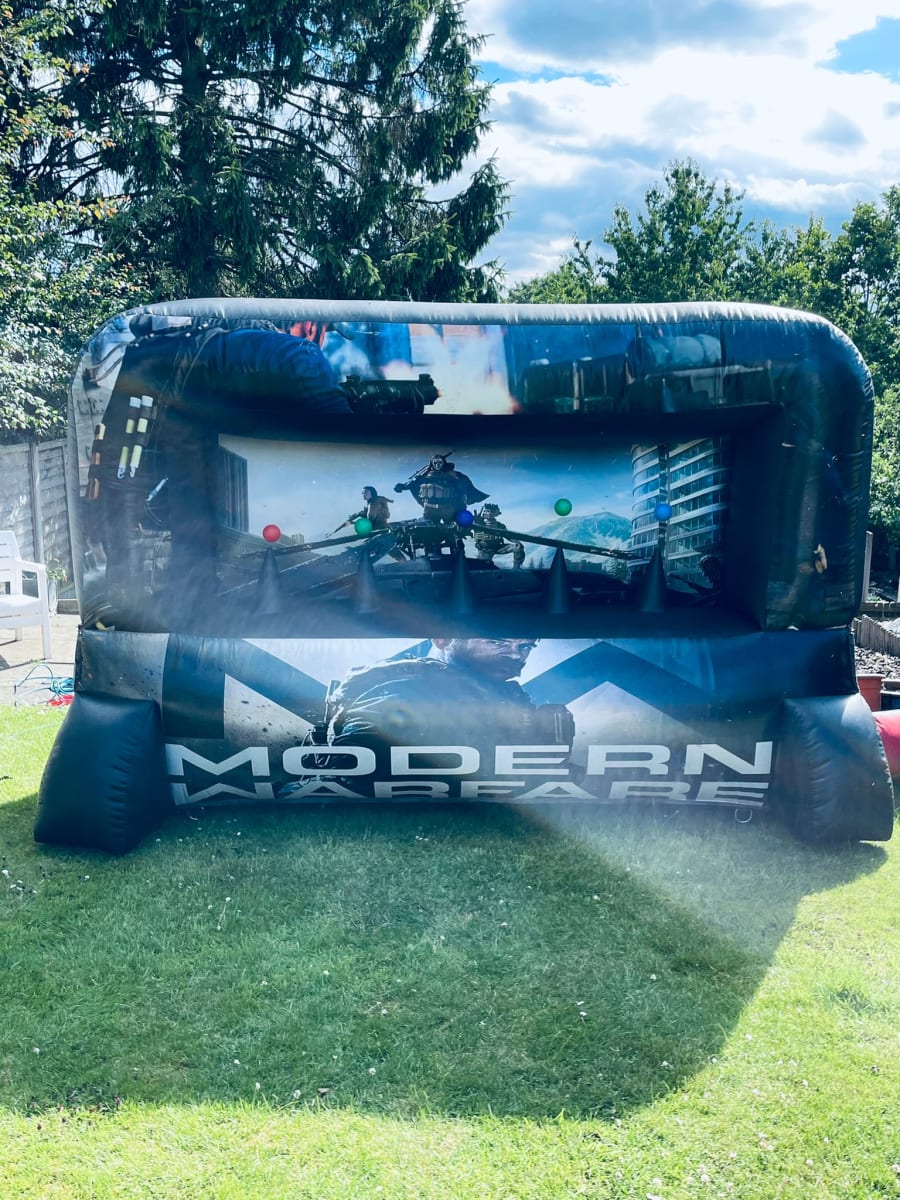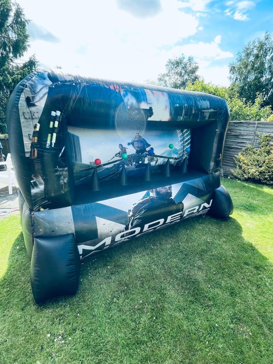 Inflatable Shooting range game. For use with Foam bullet guns. Float light plastic balls above the air jugglers and take aim with your Modern Warfare guns! Great for any war zone or Modern Warfare fan!!!