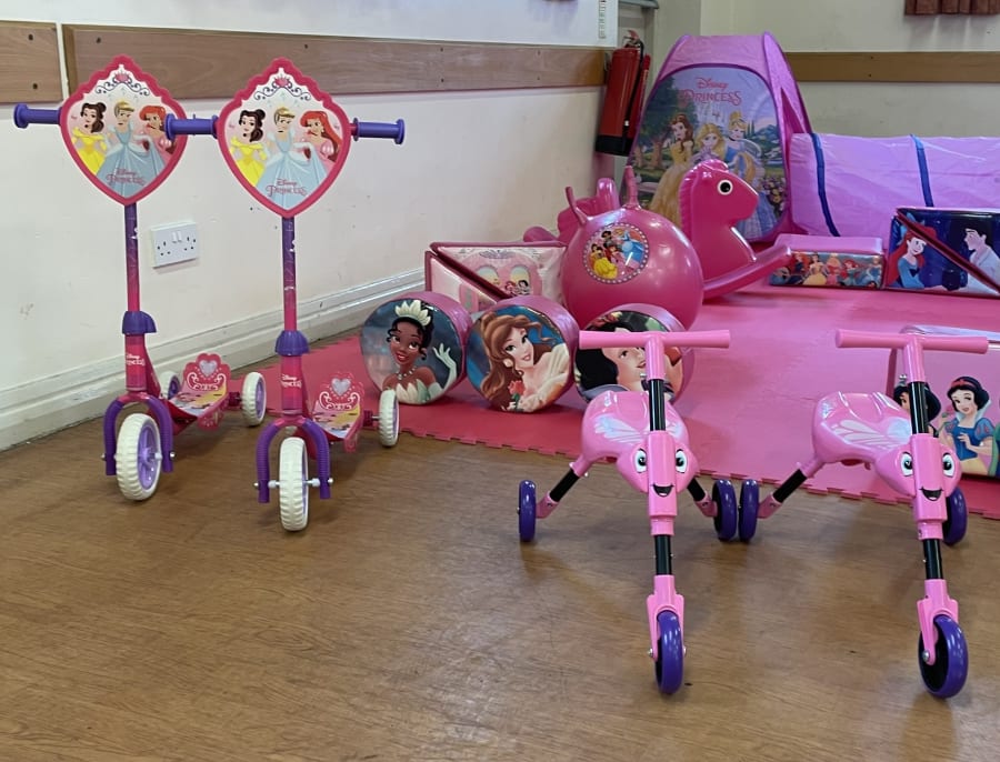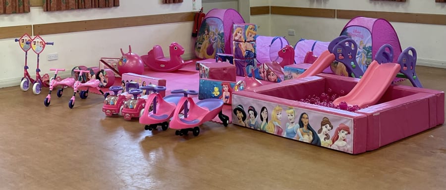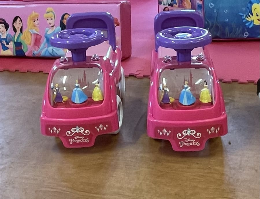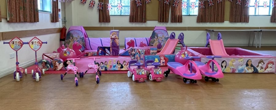 Princess Large Package Tent x2 *may vary Princess Ride On Cars x2 Princess Scooter x2 Pink Scuttle Bugs x2 Princess Soft Play Shapes x x17 Pink Tunnels x2 Pink Slides x2 Princess Hoppers x2