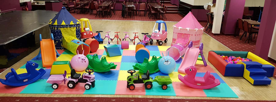 Large Package (Boys & Girls) Tents x2 *may vary Tyke Cars x2 Wiggle Cars x3 Scuttle Bug Bikes x4 Soft play shapes x x6 Tunnels x2 Slides x2 Hoppers x2 Seesaws x2 Rockers x2 Tractors x1 Ball Pit (Complete with balls & step) Soft Play Mats (Multi Coloured)
